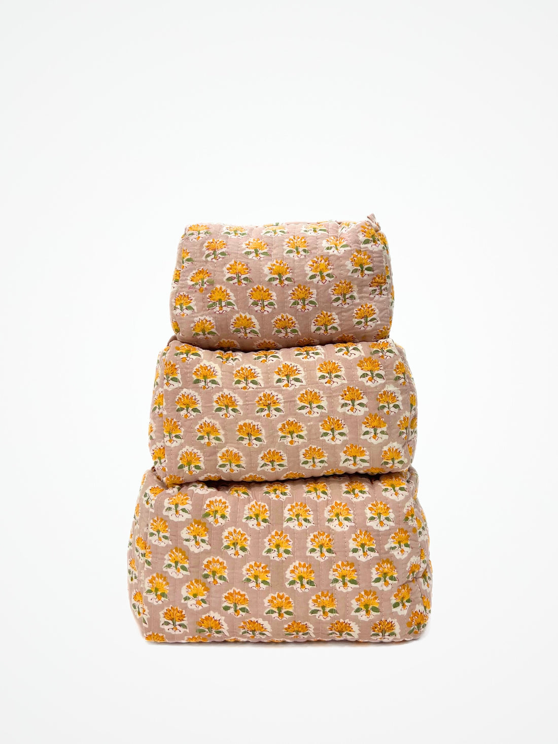 Quilted cotton beauty case in a warm copper hue, adorned with an elegant allover floral...