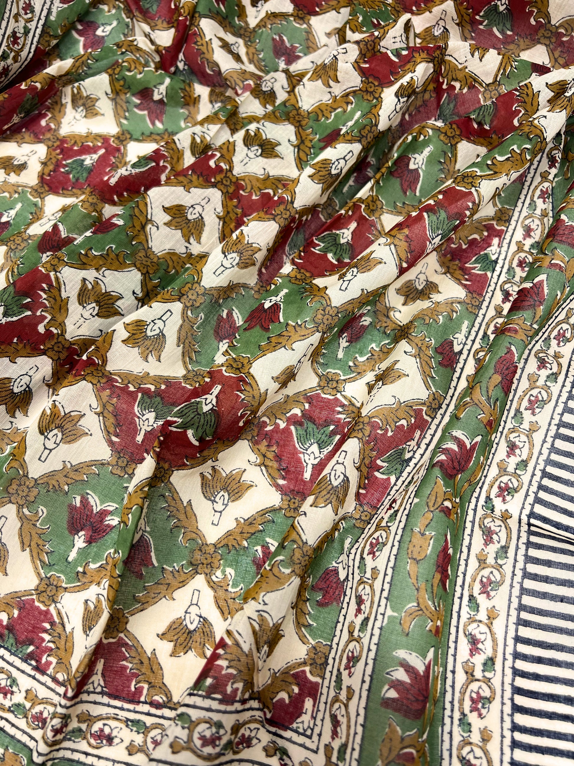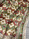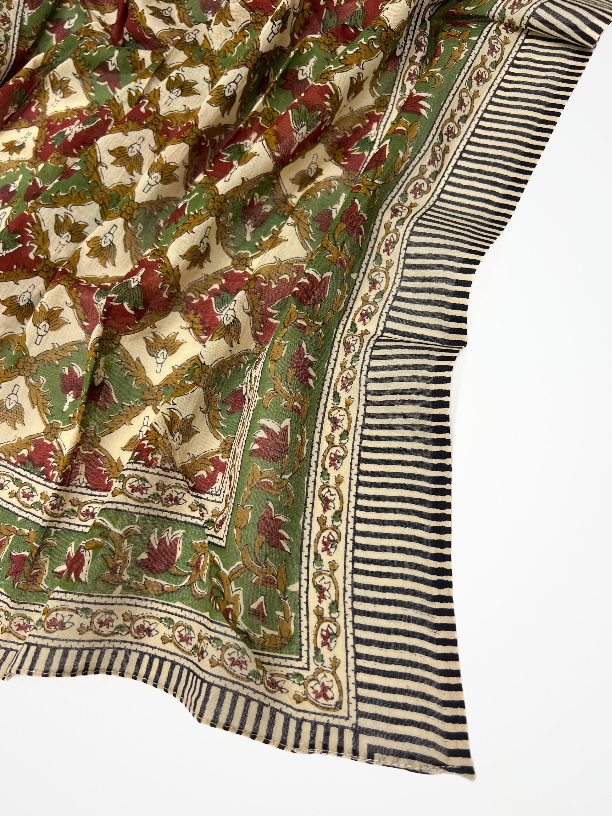 Pure cotton beach wrap, versatile and practical. Perfect as a sarong, beach cover-up, or summer pareo, this accessory offers softness, breathability, and the comfort of pure cotton. The high-quality natural fabric keeps you fresh even on hot days, making it ideal for the beach, pool, or a casual-chic summer look. Its versatility allows you to wear it in various ways: as a pareo or sarong wrapped around the waist, as an elegant beach cover-up for a beach walk, or draped over the shoulders as a shawl. A must-have for any occasion, this cotton beach wrap is perfect for those looking for a sophisticated yet practical accessory. This pareo features a timeless block print design, characterized by a geometric diamond pattern with stylized floral details in shades of olive green and red on a natural beige background. The edges are adorned with a delicate black striped geometric border, adding a refined contrast to the bold print. Its timeless elegance also makes it great for everyday use, as a cotton scarf for spring or summer or as a stylish accent for cooler evenings. Made from pure cotton, it’s the ideal choice for those seeking a natural fabric that’s gentle on the skin yet durable. Each piece is unique, balancing comfort and refinement, perfect for those who desire class without sacrificing practicality. Made in India, this cotton beach wrap combines quality with tradition and elegance, offering a versatile accessory that fits any look.