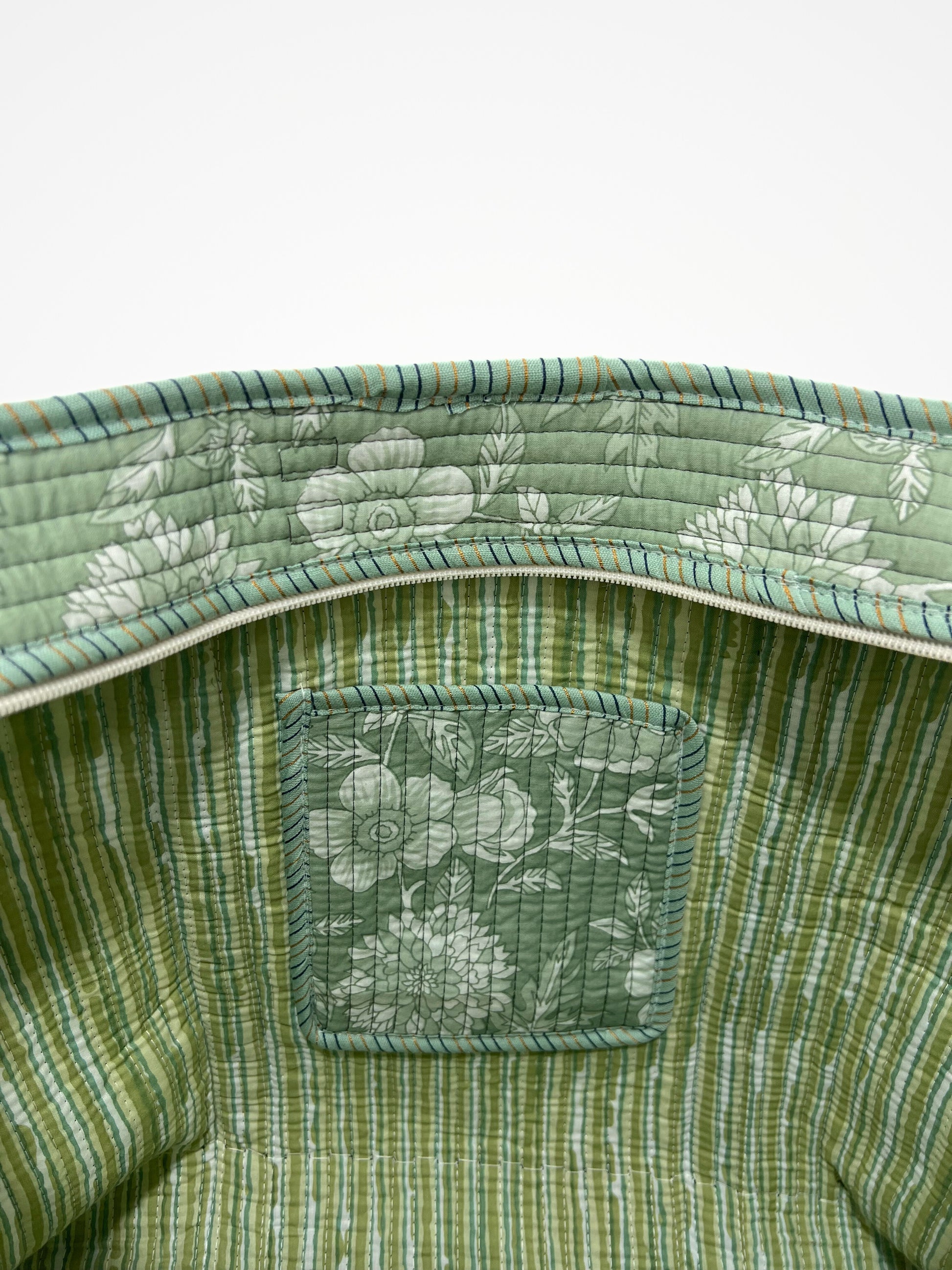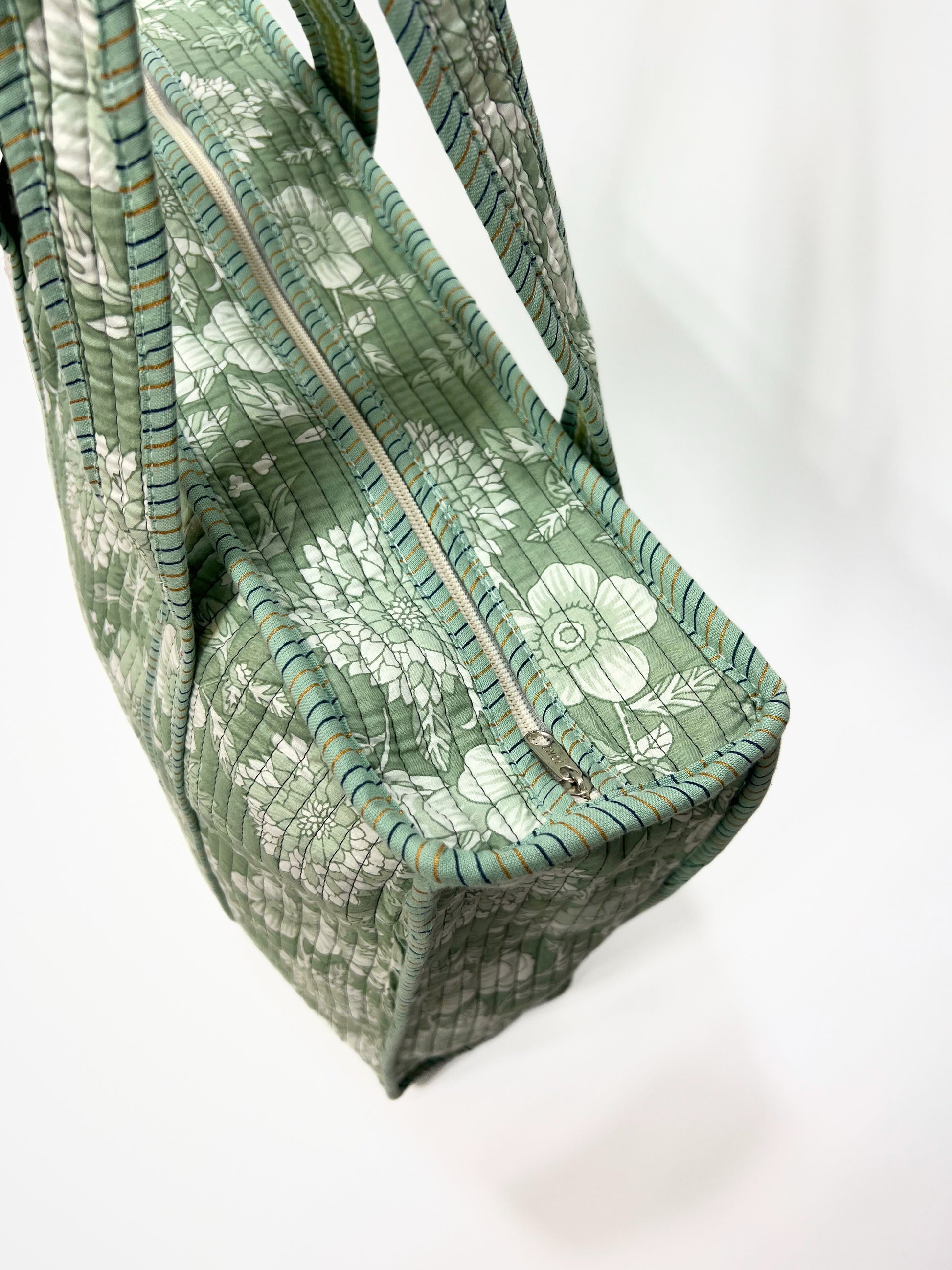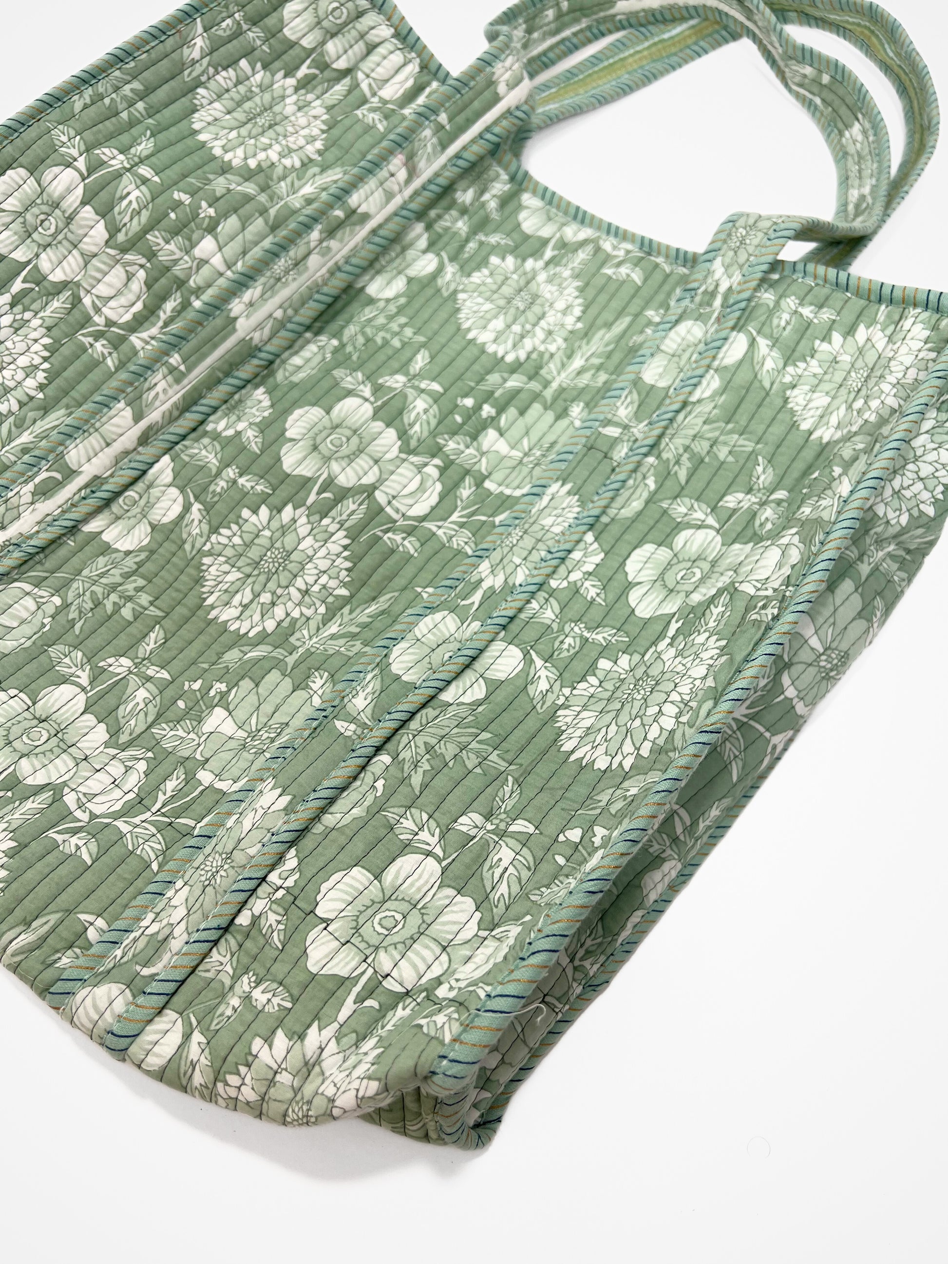 Borsa tote stampata in cotone, scelta perfetta per chi cerca un accessorio pratico, leggero e multifunzionale. Questa borsa shopper in cotone dalle dimensioni compatte si distingue per la sua forma pratica e versatile, ideale per accompagnarti nelle attività quotidiane, come una passeggiata in città o una giornata di lavoro con stile. Adatta da portare a mano o a spalla, la borsa di stoffa combina praticità e stile con un design sofisticato. Usala come borsa da giorno per la tua routine quotidiana o come borsa in cotone nel tempo libero. Ideale anche per le mamme che cercano praticità ed eleganza in un formato compatto. Il design pieghevole la rende perfetta da riporre in valigia e da utilizzare quando serve, senza occupare spazio inutile. Questa tote bag si distingue con una floreale raffinata su un fondo verde acqua, caratterizzata da un elegante motivo floreale in tonalità chiare che crea un contrasto armonioso. I fiori e le foglie si intrecciano con grazia, evocando un'estetica romantica e vintage, perfetta per un look boho-chic o uno stile sofisticato dal fascino retrò. L’interno è completamente foderato a righe intonato, aggiungendo un tocco fresco e romantico, ed è dotato di una pratica tasca ideale per riporre il cellulare, chiavi o altri piccoli oggetti essenziali. I due manici offrono opzioni di trasporto sia a mano che a spalla, mentre la chiusura con zip aggiunge funzionalità e praticità. Ogni borsa è fatta a mano con amore in India, supportando il lavoro artigianale locale e promuovendo l’uso di materiali di qualità.