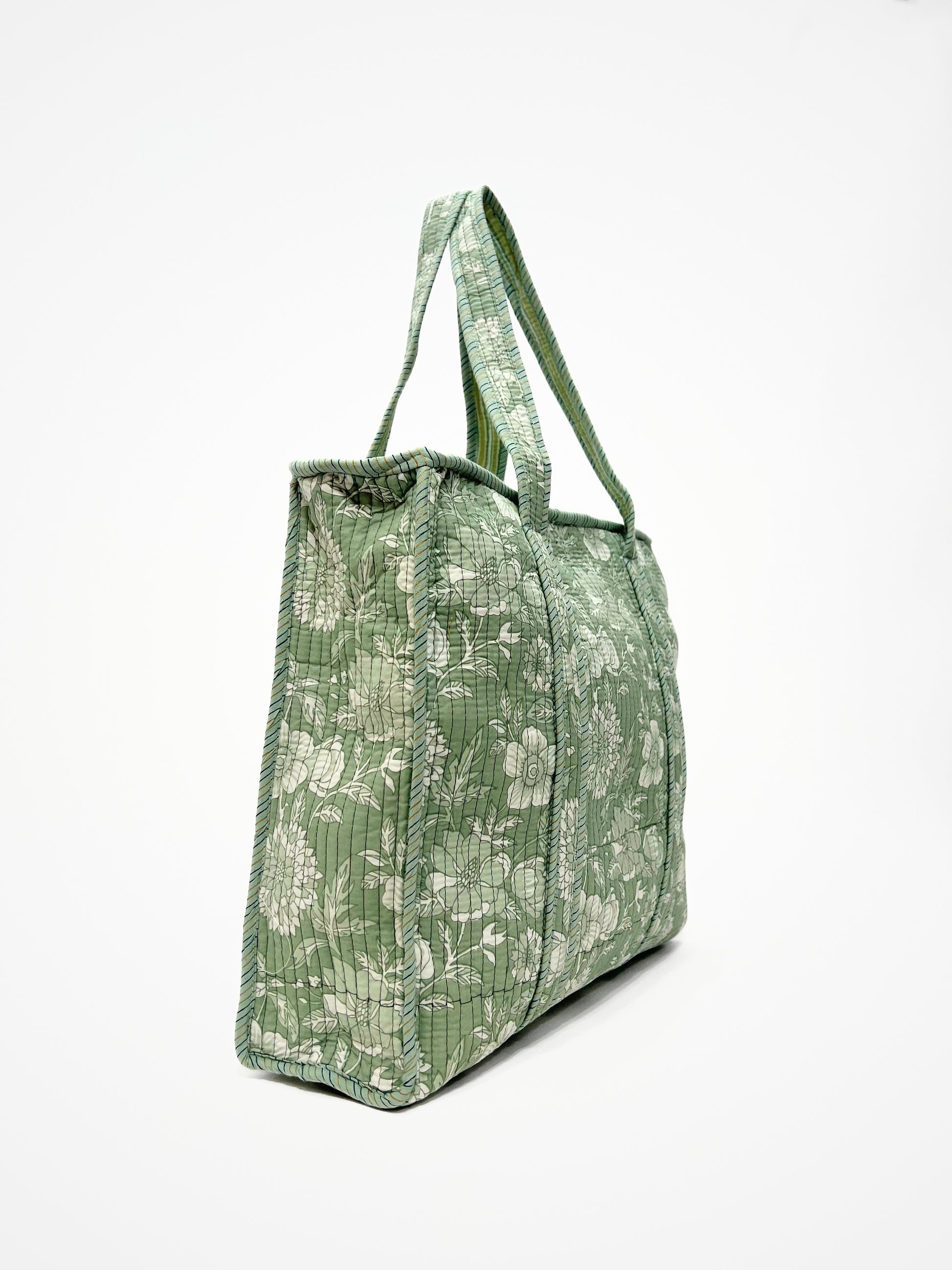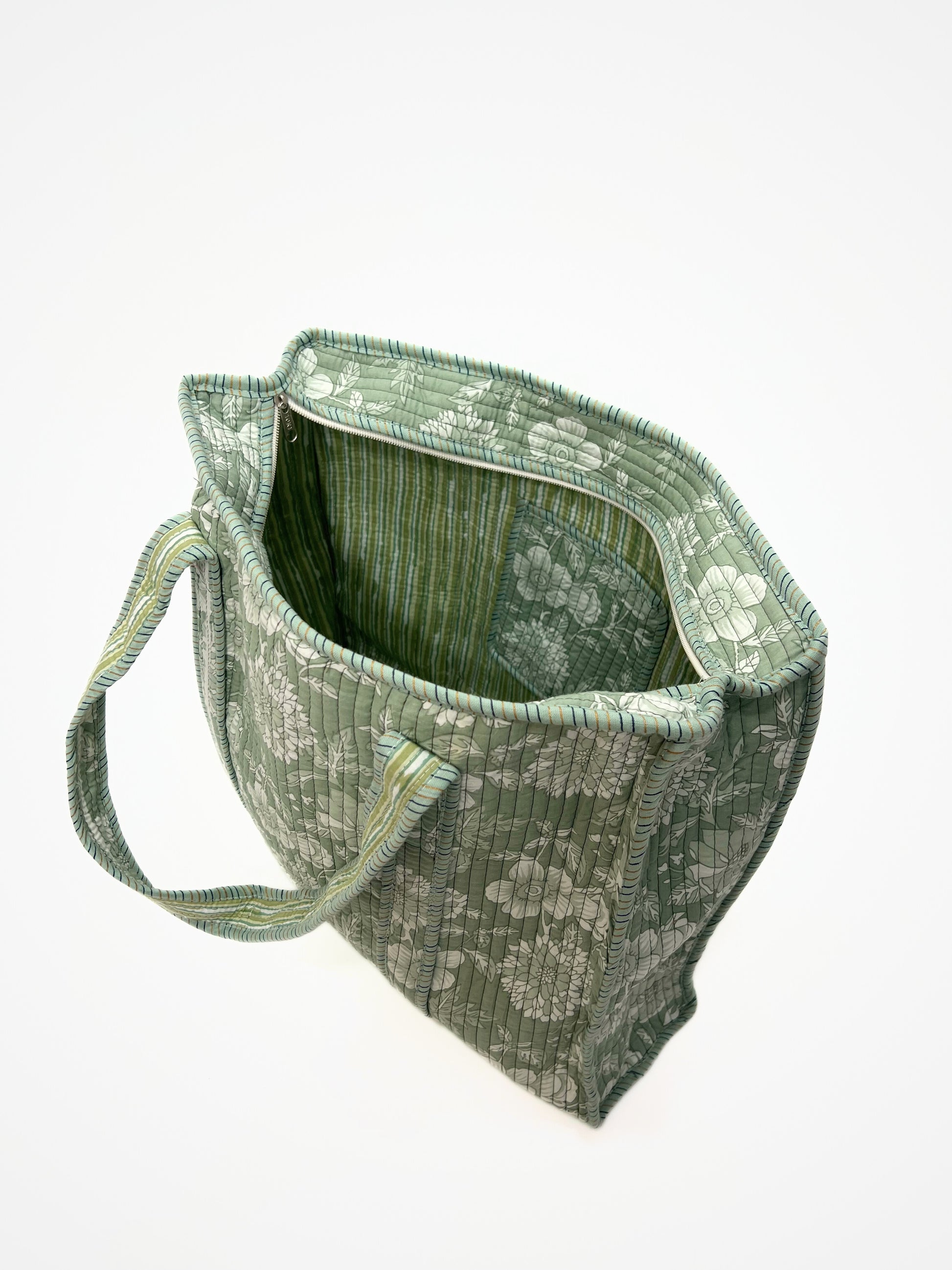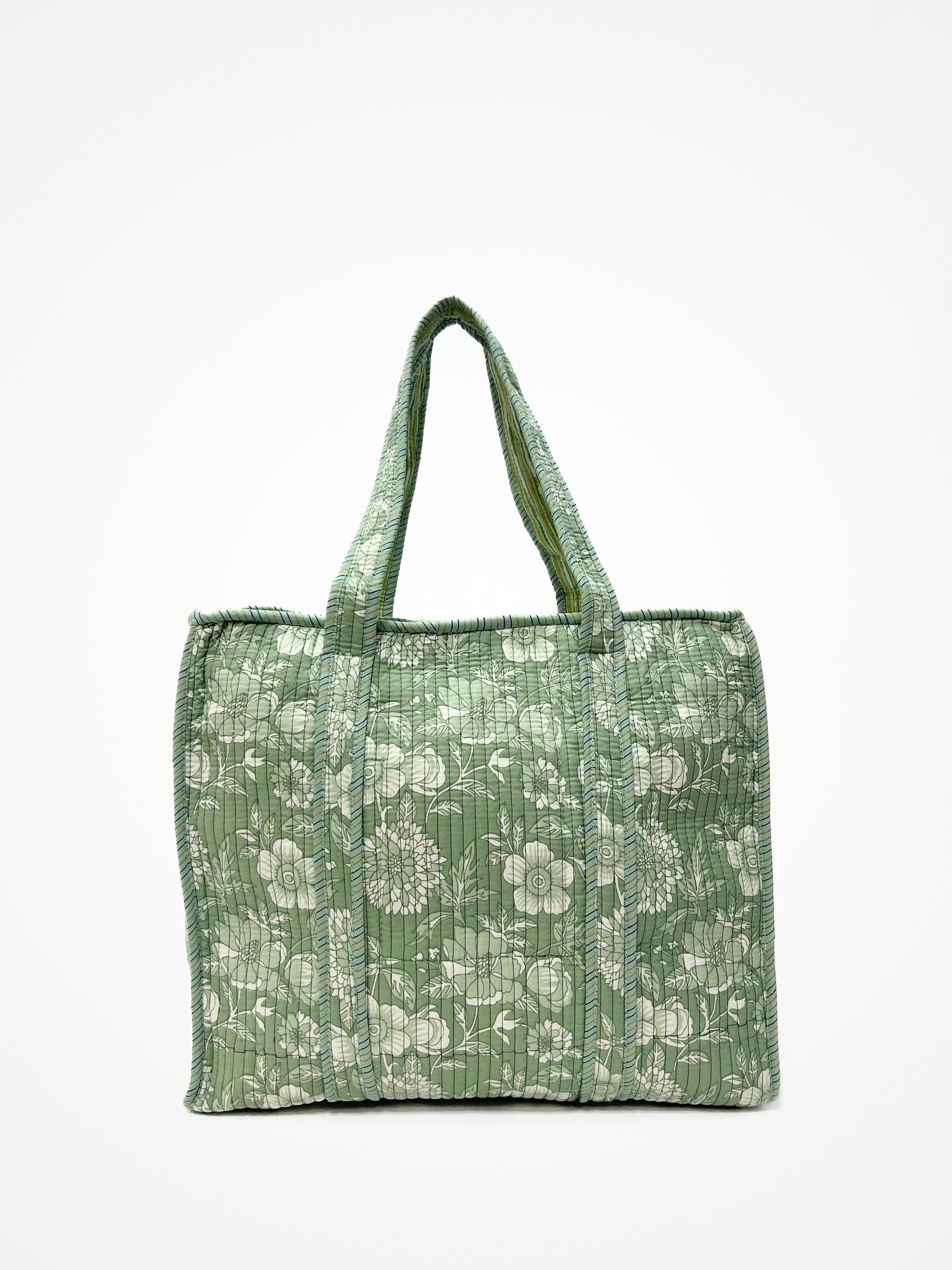 Borsa tote stampata in cotone, scelta perfetta per chi cerca un accessorio pratico, leggero e multifunzionale. Questa borsa shopper in cotone dalle dimensioni compatte si distingue per la sua forma pratica e versatile, ideale per accompagnarti nelle attività quotidiane, come una passeggiata in città o una giornata di lavoro con stile. Adatta da portare a mano o a spalla, la borsa di stoffa combina praticità e stile con un design sofisticato. Usala come borsa da giorno per la tua routine quotidiana o come borsa in cotone nel tempo libero. Ideale anche per le mamme che cercano praticità ed eleganza in un formato compatto. Il design pieghevole la rende perfetta da riporre in valigia e da utilizzare quando serve, senza occupare spazio inutile. Questa tote bag si distingue con una floreale raffinata su un fondo verde acqua, caratterizzata da un elegante motivo floreale in tonalità chiare che crea un contrasto armonioso. I fiori e le foglie si intrecciano con grazia, evocando un'estetica romantica e vintage, perfetta per un look boho-chic o uno stile sofisticato dal fascino retrò. L’interno è completamente foderato a righe intonato, aggiungendo un tocco fresco e romantico, ed è dotato di una pratica tasca ideale per riporre il cellulare, chiavi o altri piccoli oggetti essenziali. I due manici offrono opzioni di trasporto sia a mano che a spalla, mentre la chiusura con zip aggiunge funzionalità e praticità. Ogni borsa è fatta a mano con amore in India, supportando il lavoro artigianale locale e promuovendo l’uso di materiali di qualità.