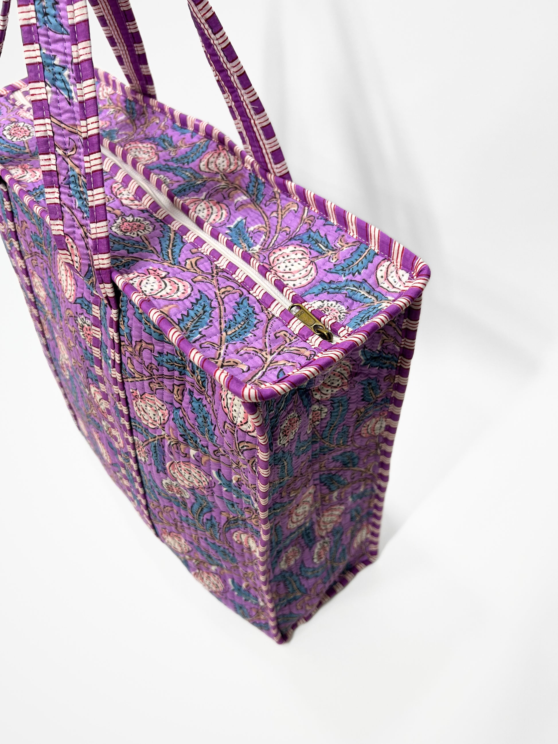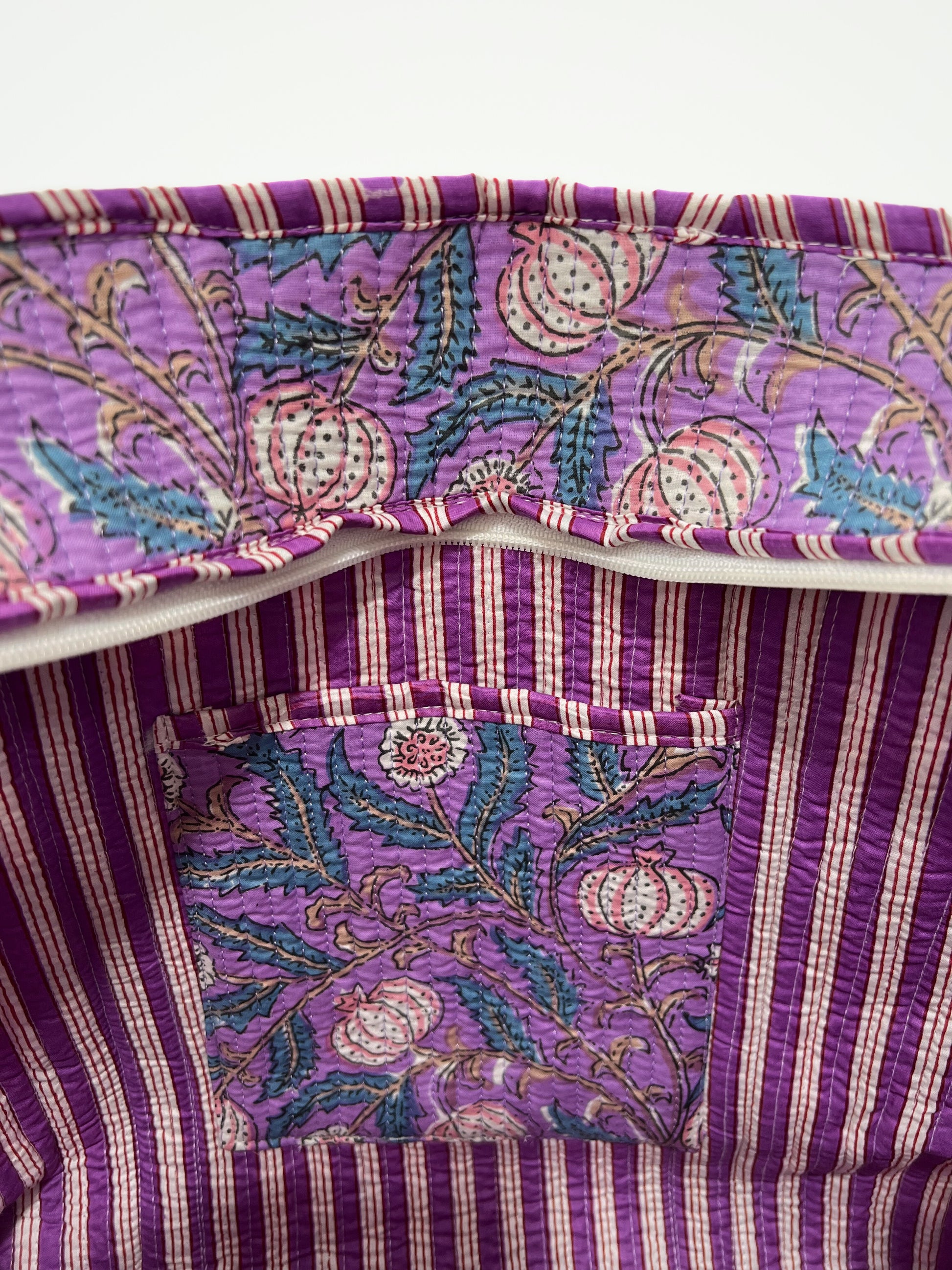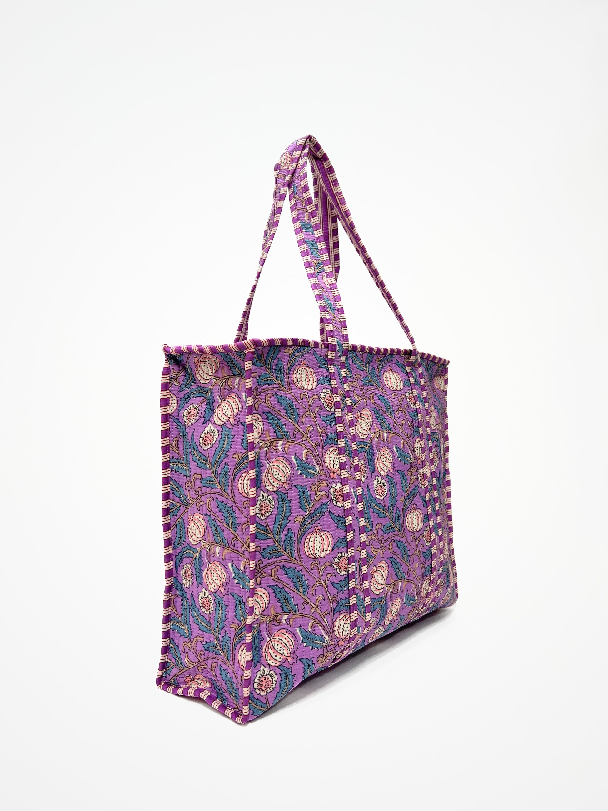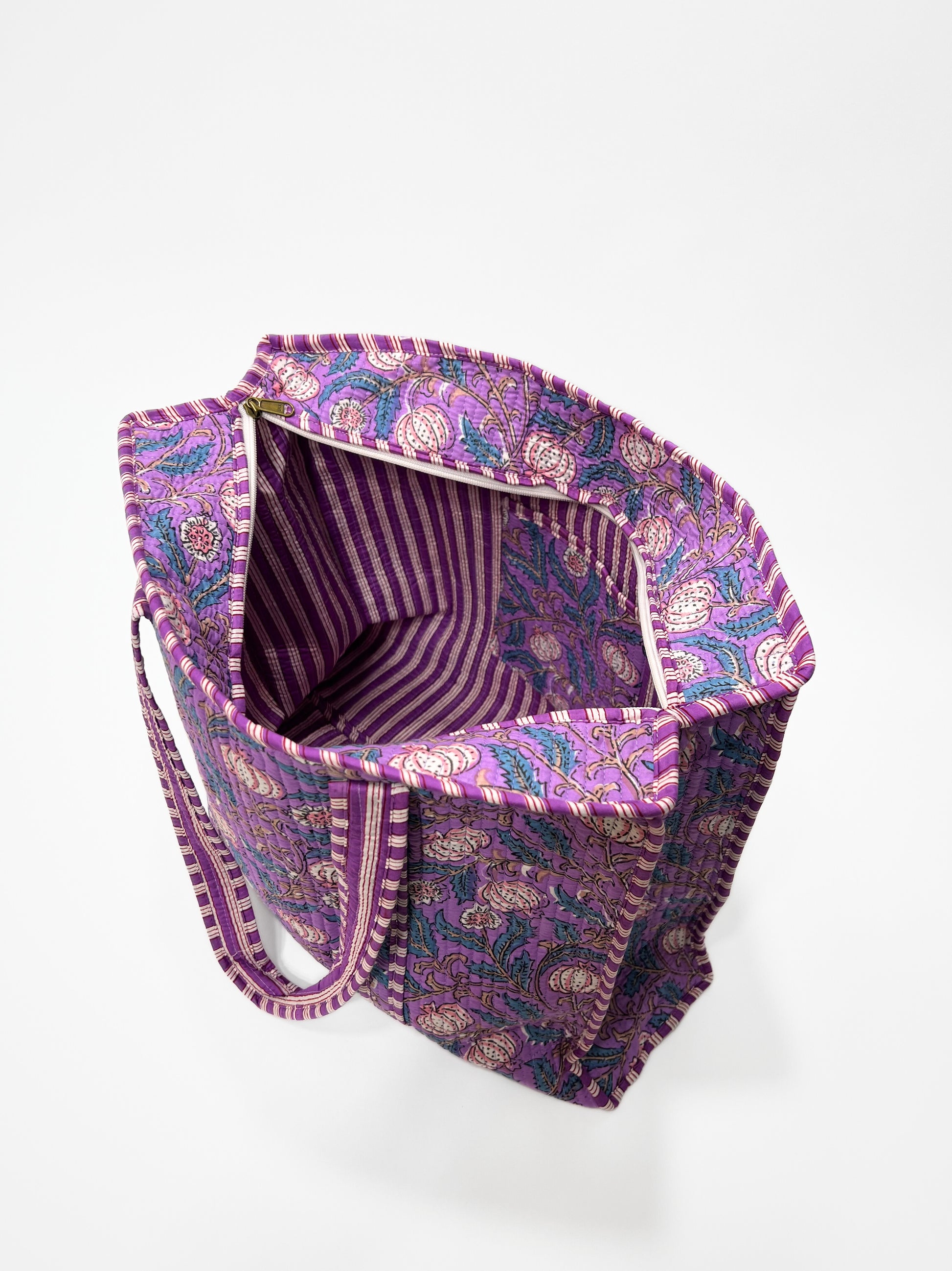 La borsa tote stampata in cotone è la scelta perfetta per chi cerca un accessorio capiente, leggero e multifunzionale. Questa borsa shopper in cotone si distingue per la sua forma capiente e pratica, perfetta per accompagnarti in ogni occasione, dal lavoro allo shopping, fino a weekend fuori porta. Realizzata in puro cotone indiano di alta qualità, offre un ampio spazio interno che la rende ideale come borsa da viaggio, borsa sportiva o pratico alleato per la vita quotidiana. La sua leggerezza straordinaria garantisce un trasporto confortevole senza appesantire, perfetta per accompagnarti in ogni avventura. Con dimensioni generose e un design sofisticato, la borsa di stoffa in cotone si presta perfettamente a molteplici utilizzi. Usala come borsa di cotone per weekend fuori porta, come borsa da viaggio in cotone per i tuoi spostamenti, come borsa sportiva per la palestra o pratica borsa per la spiaggia. Perfetta anche per le mamme, con spazio sufficiente per organizzare tutto il necessario per bambini e neonati, senza rinunciare a stile e funzionalità. Il design pieghevole la rende perfetta da riporre in valigia e da utilizzare quando serve, senza occupare spazio inutile. Questa borsa tote trapuntata, dal design unico e raffinato, è un vero tributo alla primavera e alla creatività artigianale. La stampa presenta un motivo floreale intricatamente dettagliato su uno sfondo lilla acceso. Il design include rami sinuosi con foglie stilizzate dai bordi frastagliati in tonalità verde e blu. L’interno è completamente foderato con un a righe, aggiungendo un tocco fresco e romantico, ed è dotato di una pratica tasca ideale per riporre il cellulare, chiavi o altri piccoli oggetti essenziali. Un accessorio elegante e senza tempo, perfetto per chi ama distinguersi con stile e apprezza la qualità artigianale. Realizzata in cotone di alta qualità, questa borsa trapuntata in cotone è il compagno ideale per chi cerca un accessorio versatile che si adatta a look casual, urban, minimalisti o anche a un outfit da ufficio rilassato. I due manici offrono opzioni di trasporto sia a mano che a spalla, mentre la chiusura con zip aggiungono funzionalità e praticità. Ogni borsa è fatta a mano con amore in India, supportando il lavoro artigianale locale e promuovendo l’uso di materiali di qualità.