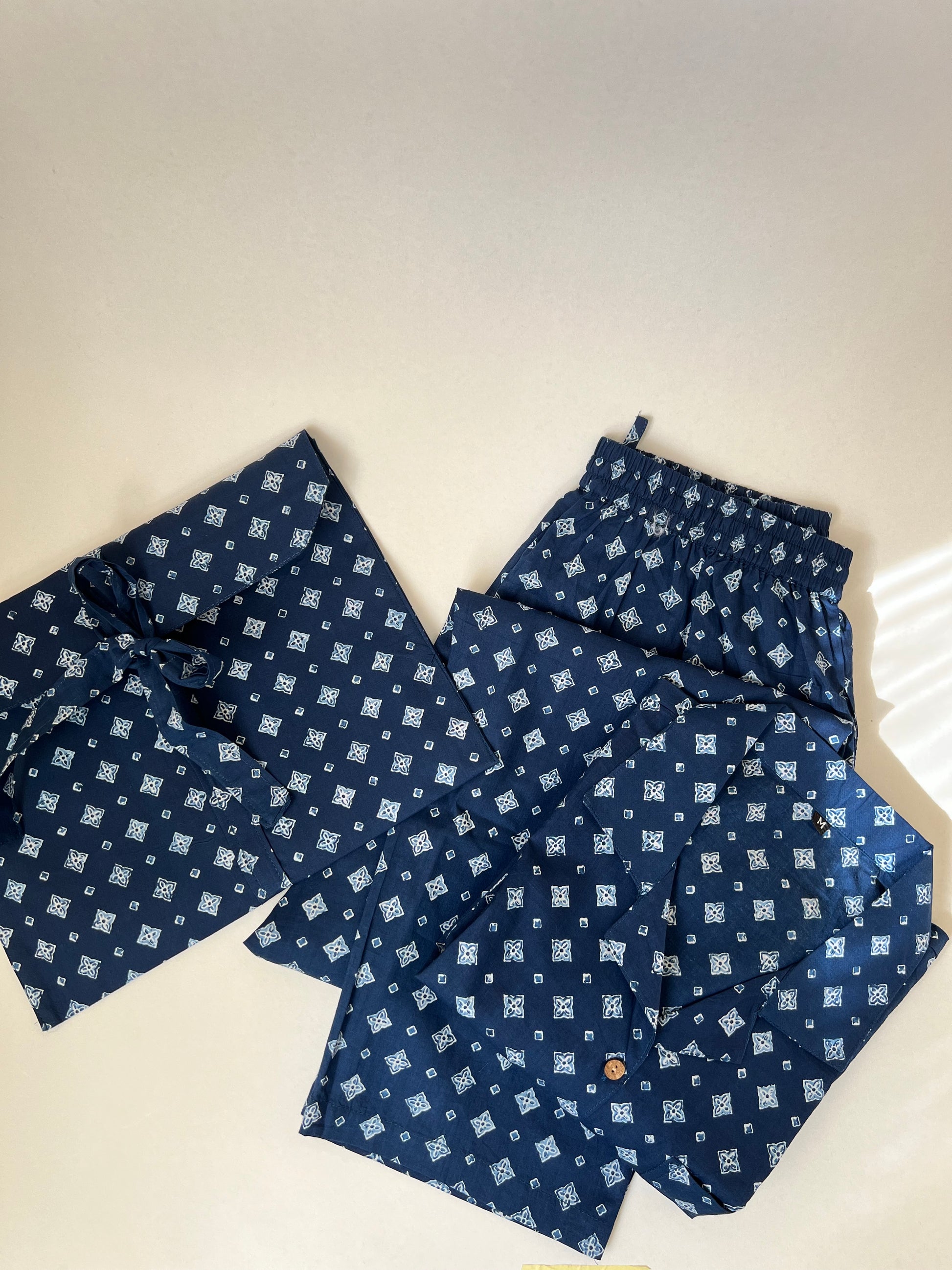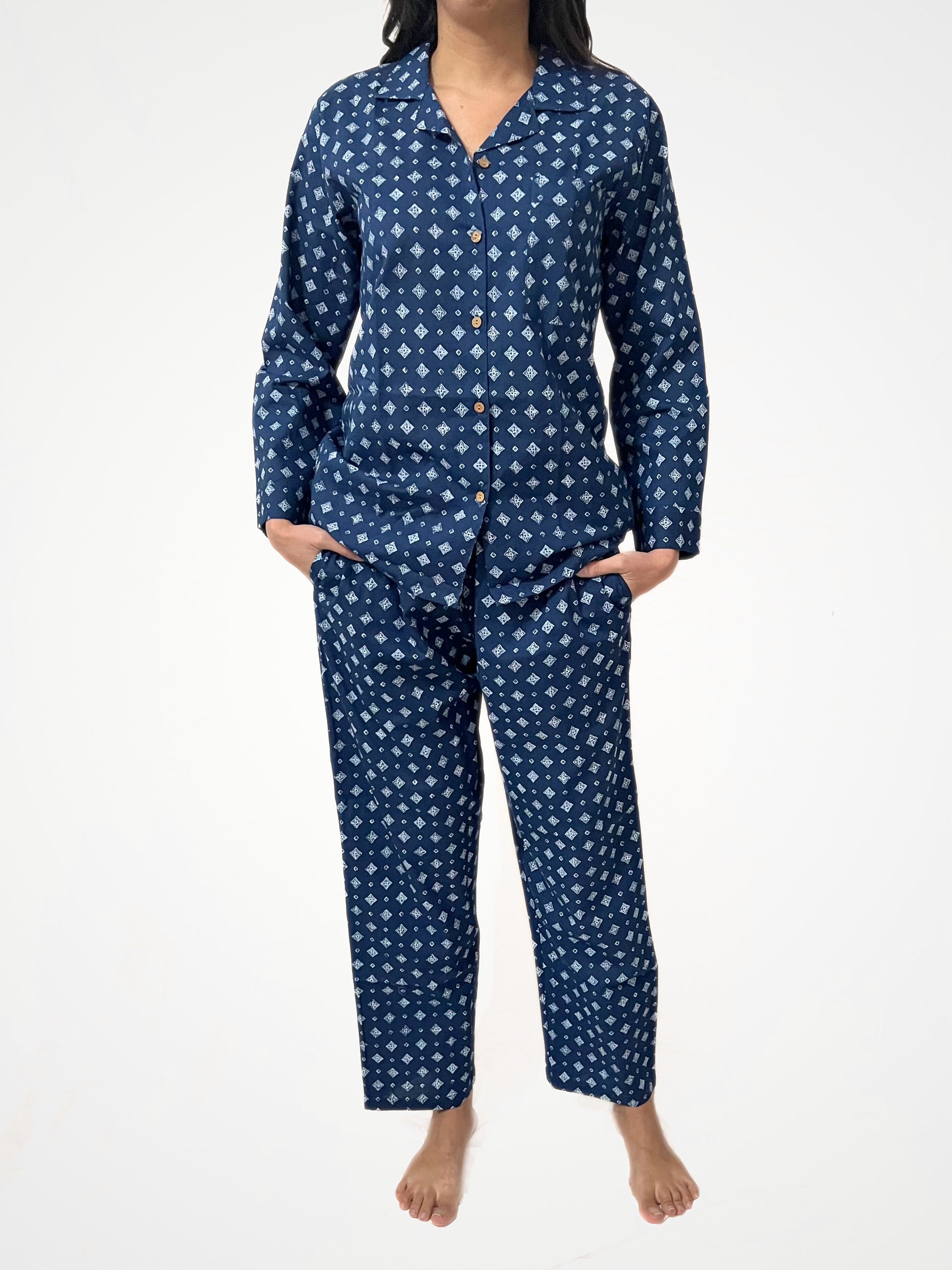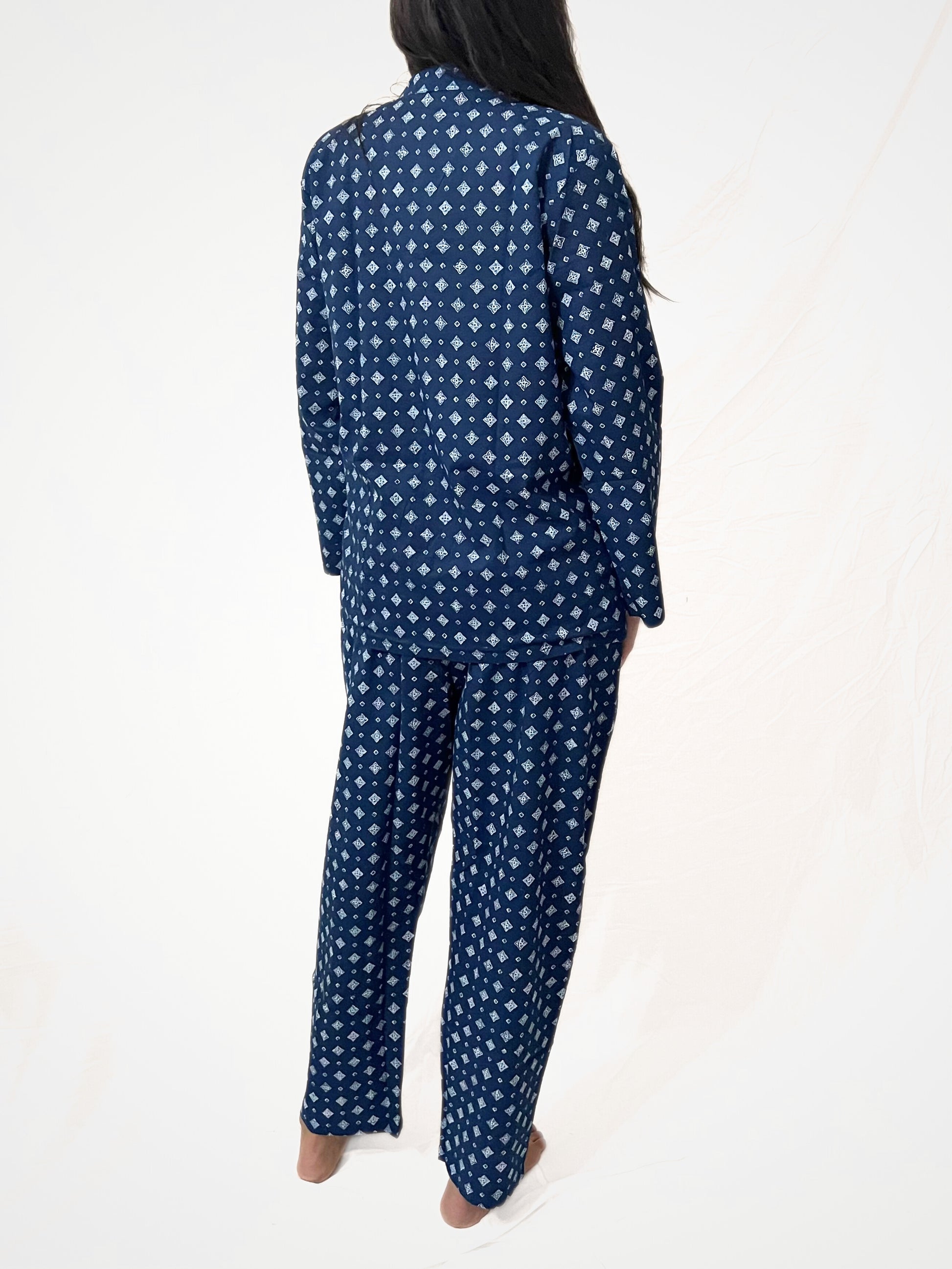 Pigiama in cotone donna che combina comfort, stile e versatilità. Questo completo in cotone a 3 pezzi include una camicia a maniche lunghe con collo a revers e tasca sul petto, pantaloni lunghi dalla linea dritta, morbidi e confortevoli, con elastico in vita e coulisse regolabile. Il pigiama in puro cotone stampato è elegantemente piegato e riposto in una graziosa pochette con laccio regolabile, perfetta per riporlo con cura o portarlo con sé in viaggio. Un coordinato camicia e pantalone perfetto per rilassarsi con eleganza o trasformare i momenti di relax in un’esperienza unica e ricercata. Il cotone, noto per la sua leggerezza e traspirabilità, rende questo capo perfetto sia come pigiama estivo donna che come pigiama mezza stagione, adattandosi a ogni periodo dell’anno. Soffice e delicato sulla pelle, il tessuto naturale regola la temperatura corporea, mantenendo il corpo fresco nelle calde giornate estive e piacevolmente confortevole quando le temperature si abbassano, risultando morbido e perfetto per chi cerca un capo di qualità che unisce praticità e piacere al tatto. La stampa di questo pigiama in cotone presenta un elegante motivo geometrico su sfondo blu intenso. Piccoli elementi decorativi, nei toni del bianco e dell’azzurro chiaro, si ripetono in un pattern ordinato, creando un effetto raffinato e senza tempo. L’alternanza di simboli intrecciati e piccoli rombi conferisce un tocco classico. Questa fantasia unisce sobrietà e stile, garantendo un look sofisticato anche nei momenti di relax. Il cotone, materiale traspirante e morbido, garantisce comfort e freschezza, perfetto per le notti più calde o per rilassarsi con stile. La camicia, con la sua tasca sul petto e il taglio dritto, offre una vestibilità versatile, mentre i pantaloni, dotati di tasche laterali e coulisse regolabile, garantiscono comodità e libertà di movimento. Ogni dettaglio è pensato per offrire funzionalità senza rinunciare a un design curato. Questo PJ set è più di un semplice set camicia e pantaloni: è un capo da reinterpretare a piacere. La camicia si abbina perfettamente a un paio di jeans per un look casual-chic, mentre i pantaloni diventano ideali con una canotta tinta unita nelle giornate più calde. La pochette, oltre a custodire il pigiama piegato con cura, è pratica per riporre piccoli oggetti o accessori. Disponibile in due taglie per adattarsi a diverse silhouette, questo pigiama donna è una bella idea regalo o un acquisto perfetto per chi cerca un capo versatile e di qualità. Indossato nella foto con taglia M, rappresenta l’equilibrio perfetto tra comfort e praticità. Lasciati conquistare da questo incantevole pigiama in cotone, progettato per offrire il massimo del relax e del benessere.