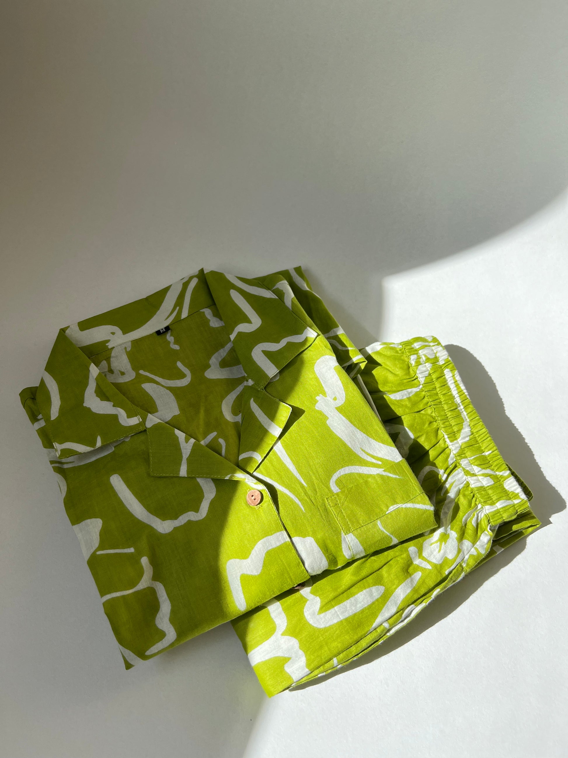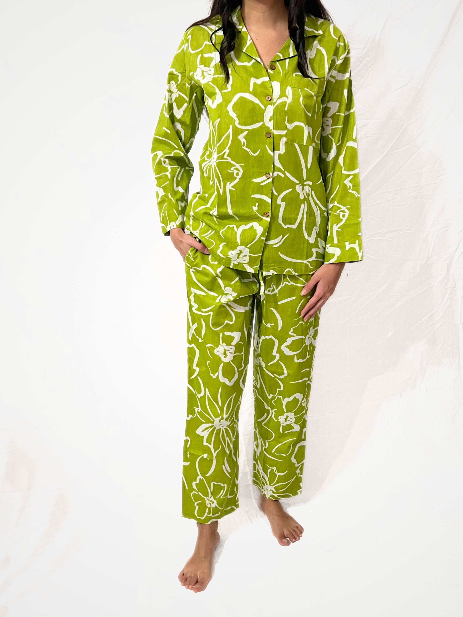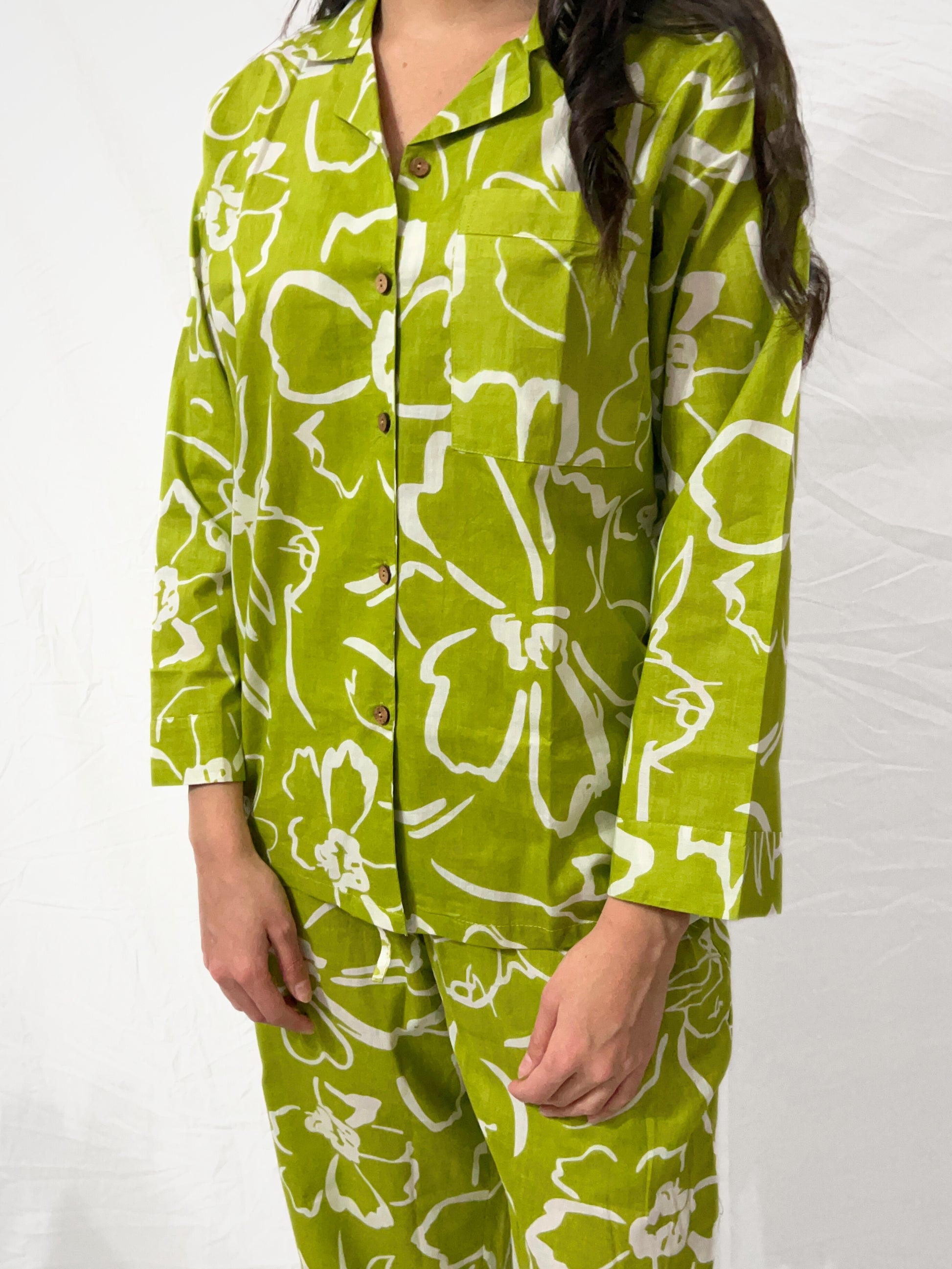 Pigiama in cotone donna che combina comfort, stile e versatilità. Questo completo in cotone a 3 pezzi include una camicia a maniche lunghe con collo a revers e tasca sul petto, pantaloni lunghi dalla linea dritta, morbidi e confortevoli, con elastico in vita e coulisse regolabile. Il pigiama in puro cotone stampato è elegantemente piegato e riposto in una graziosa pochette con laccio regolabile, perfetta per riporlo con cura o portarlo con sé in viaggio. Un coordinato camicia e pantalone perfetto per rilassarsi con eleganza o trasformare i momenti di relax in un’esperienza unica e ricercata. Il cotone, noto per la sua leggerezza e traspirabilità, rende questo capo perfetto sia come pigiama estivo donna che come pigiama mezza stagione, adattandosi a ogni periodo dell’anno. Soffice e delicato sulla pelle, il tessuto naturale regola la temperatura corporea, mantenendo il corpo fresco nelle calde giornate estive e piacevolmente confortevole quando le temperature si abbassano, risultando morbido e perfetto per chi cerca un capo di qualità che unisce praticità e piacere al tatto. La stampa di questo pigiama in cotone presenta un motivo floreale tropicale su una base lime vibrante, perfetto per un look fresco e rilassato. Il design è caratterizzato da grandi fiori stilizzati e foglie astratte in bianco, con linee fluide e naturali che creano un effetto leggermente artistico e disinvolto. L’andamento del pattern è casuale e dinamico, donando al tessuto un tocco di leggerezza e movimento. Il contrasto tra il verde lime e il bianco aggiunge un'energia vivace e moderna, rendendo questo pigiama ideale per chi ama lo stile tropicale e sofisticato. Il cotone, materiale traspirante e morbido, garantisce comfort e freschezza, perfetto per le notti più calde o per rilassarsi con stile. La camicia, con la sua tasca sul petto e il taglio dritto, offre una vestibilità versatile, mentre i pantaloni, dotati di tasche laterali e coulisse regolabile, garantiscono comodità e libertà di movimento. Ogni dettaglio è pensato per offrire funzionalità senza rinunciare a un design curato. Questo PJ set è più di un semplice set camicia e pantaloni: è un capo da reinterpretare a piacere. La camicia si abbina perfettamente a un paio di jeans per un look casual-chic, mentre i pantaloni diventano ideali con una canotta tinta unita nelle giornate più calde. La pochette, oltre a custodire il pigiama piegato con cura, è pratica per riporre piccoli oggetti o accessori. Disponibile in due taglie per adattarsi a diverse silhouette, questo pigiama donna è una bella idea regalo o un acquisto perfetto per chi cerca un capo versatile e di qualità. Indossato nella foto con taglia M, rappresenta l’equilibrio perfetto tra comfort e praticità. Lasciati conquistare da questo incantevole pigiama in cotone, progettato per offrire il massimo del relax e del benessere.